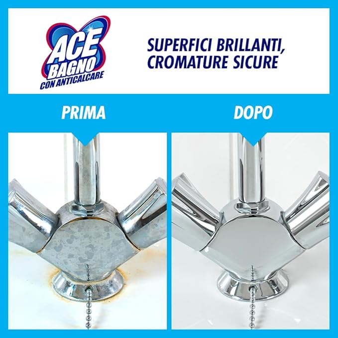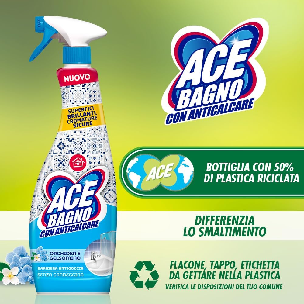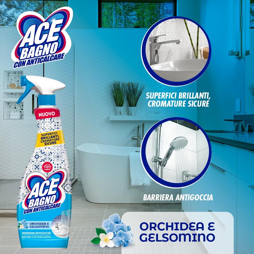 ACE Spray Bagno con Anticalcare grazie alla sua speciale formula con Barriera Antigoccia, rimuove il calcare e ne previene la formazione lasciando le superfici brillanti a lungo. In più, è sicuro sulle cromature e diffonde nel bagno un fresco profumo con note di eucalipto e menta.