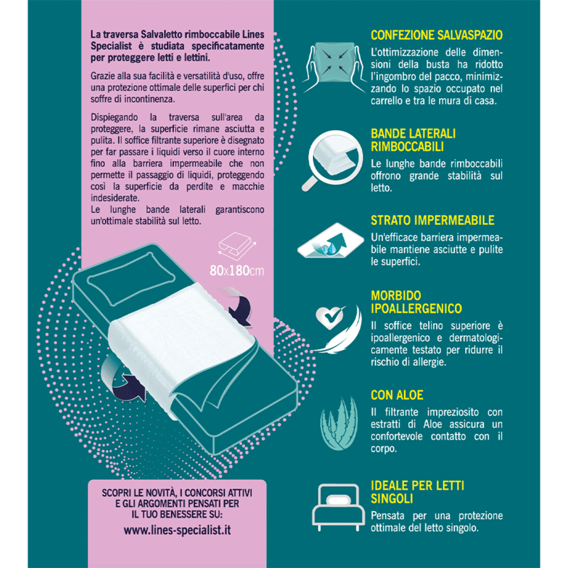 La traversa Salvaletto rimboccabile Lines Specialist 80X180 è studiata per proteggere letti e lettini. Grazie alla sua facilità e versatilità d'uso, offre una protezione ottimale delle superfici per chi soffre di incontinenza.