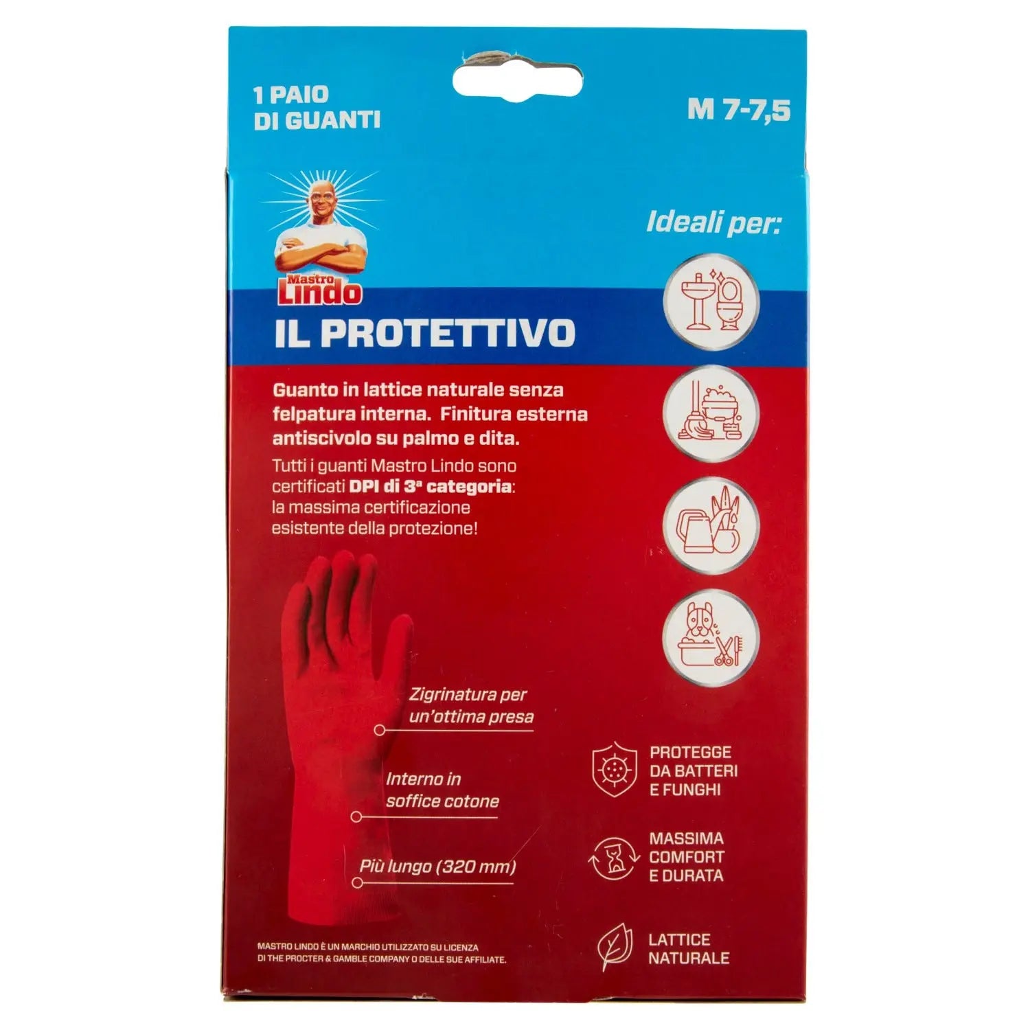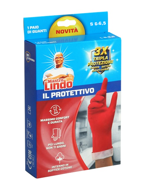 Il Guanto Protettivo di Mastro Lindo è in lattice naturale e senza felpatura interna. Finitura esterna antiscivolo su palmo e dita.