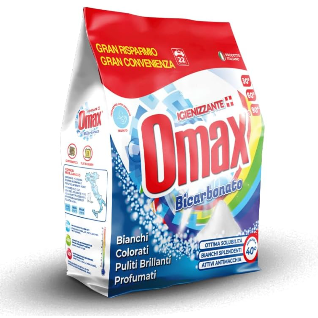 OMAX BICARBONATO Detersivo per Lavatrice in Polvere Igienizzante 22 Lavaggio, Per Capi Bianchi E Colorati Pulito Profondo