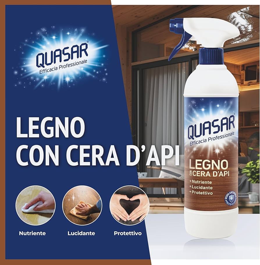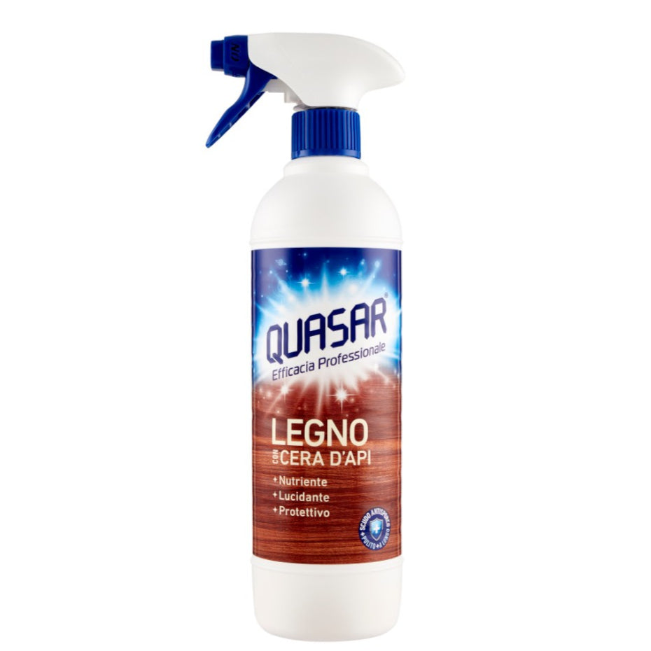 Detergente spray per Legno Con Cera D'Api di Quasar è ideale per pulire e lucidare le superfici e gli arredi in legno. La sua speciale formula dona brillantezza senza lasciare tracce e aloni. Arricchito con cera d'api, assicura inoltre un effetto protettivo e antipolvere garantendo un pulito di lunga durata.